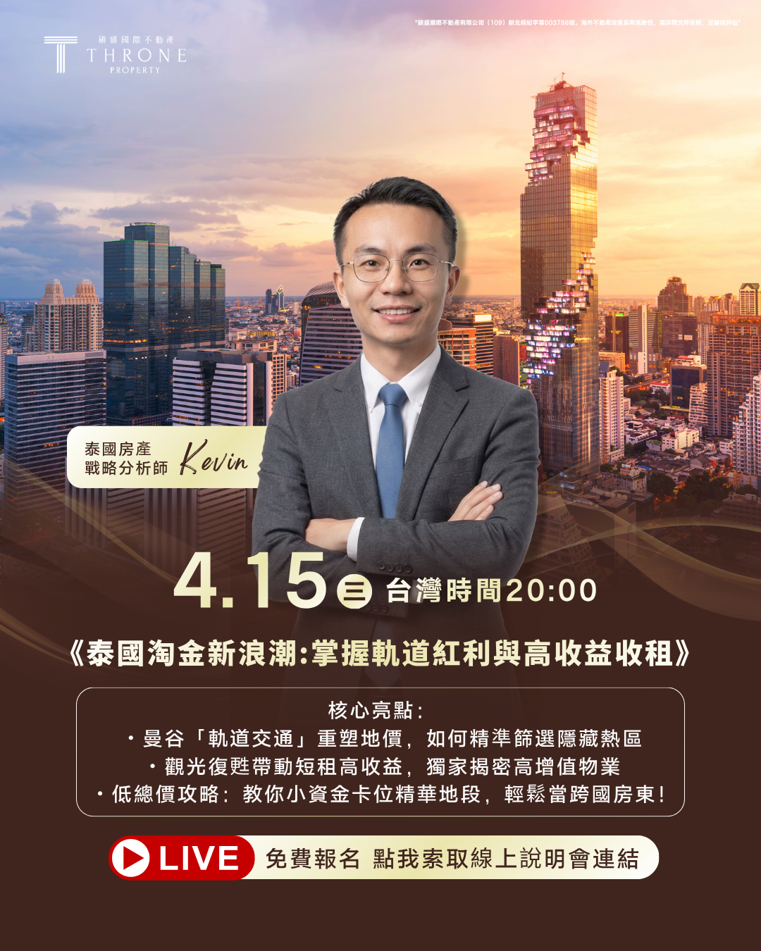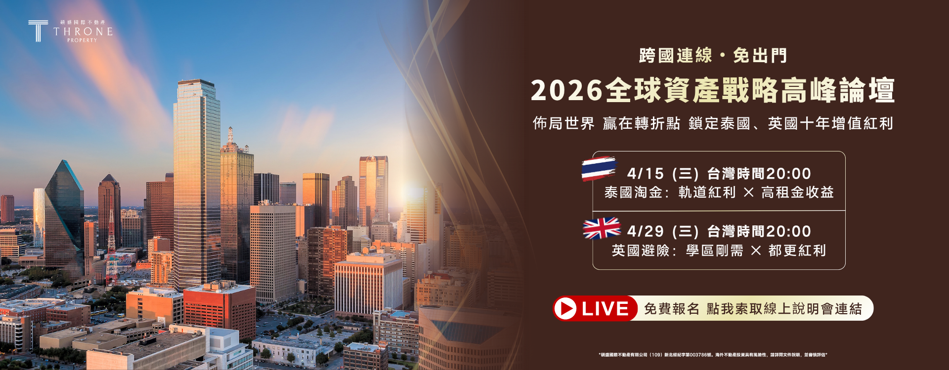 【線上說明會】2026年4月15日&29日 免費報名 2026 全球資產線上高峰論壇,佈局世界,贏在轉折點。鎖定泰國、英國十年增值紅利