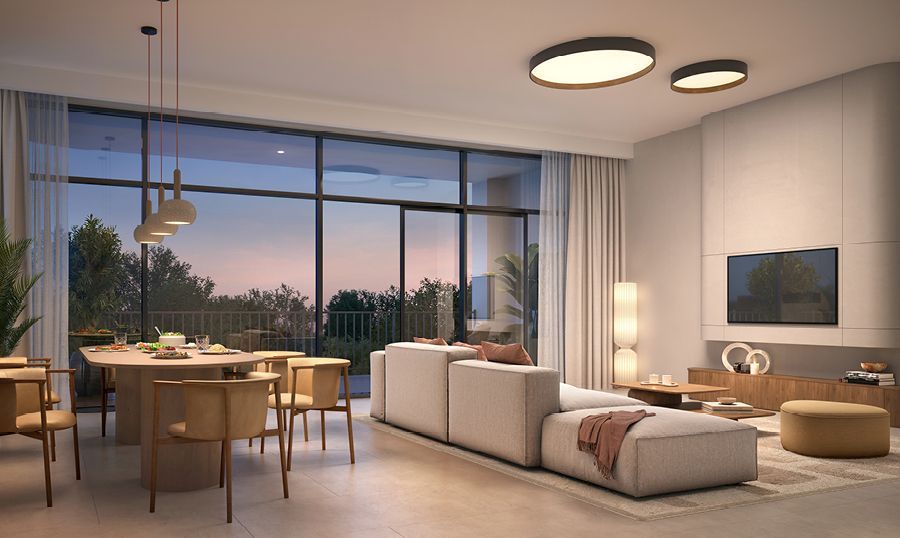 Ghaf Woods——杜拜首個森林公寓社區,占地約 73.8 萬平方公尺,綠化覆蓋率高達 80%,4 萬棵沙漠牧豆樹環繞,每戶平均坐擁 6 棵綠樹,社區內空氣品質比周邊高 20%,溫度低 5°C,堪稱「都市避暑秘境」。這裡不僅是綠化的極致體現,更是宜居與投資的雙贏選擇。清晨推開窗,鳥鳴聲與綠意盎然的景觀相伴,彷彿置身森林浴。
