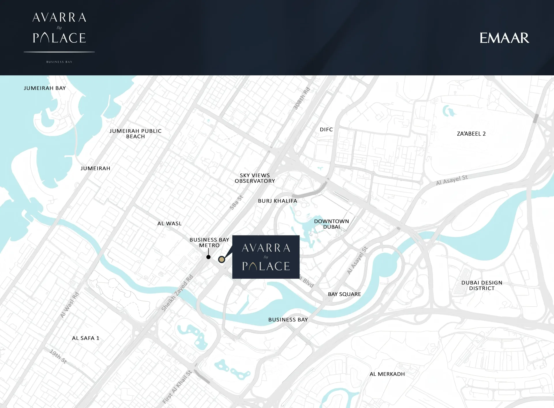 由杜拜最大開發商 Emaar 開發的 Avarra by Palace 項目,將奢華水岸生活帶到商務港,可飽覽杜拜運河和杜拜市中心的壯麗景色。該項目擁有世界一流的配套設施,地理位置優越,毗鄰哈里發塔,是尋求杜拜高端房地產的投資者的理想之選。