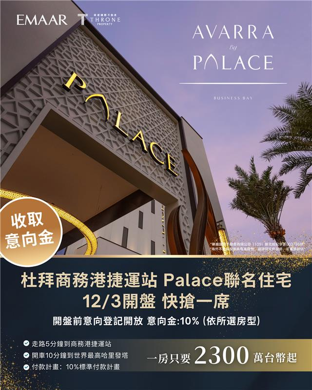 【12/3 開盤前意向收取】杜拜最大開發商 Emaar 商務港捷運站全新聯名公寓--Avarra by Palace