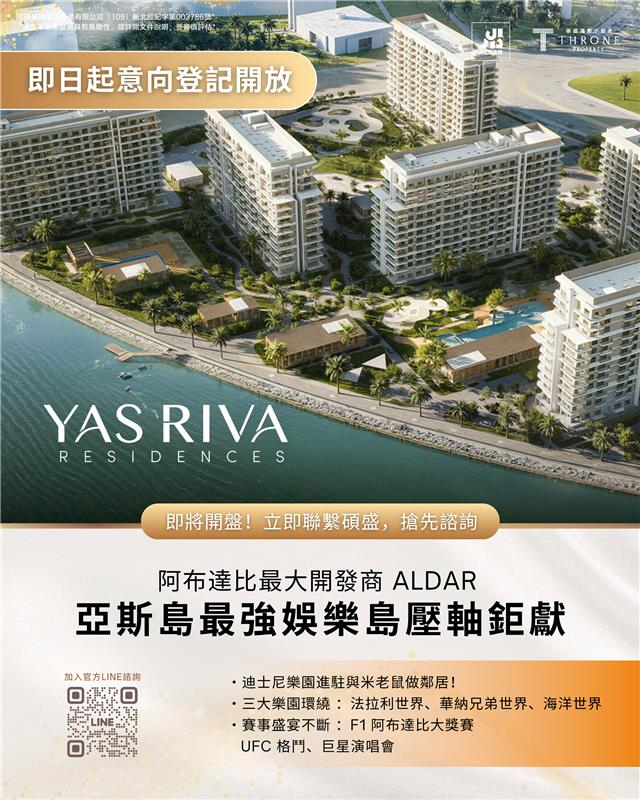 - Yas Riva Residences 位於亞斯島北岸,緊鄰先前已全數售罄的別墅社區 Yas Riva,項目將以度假式設計重新詮釋水岸生活,融合冒險、健康與社交連結等元素。
